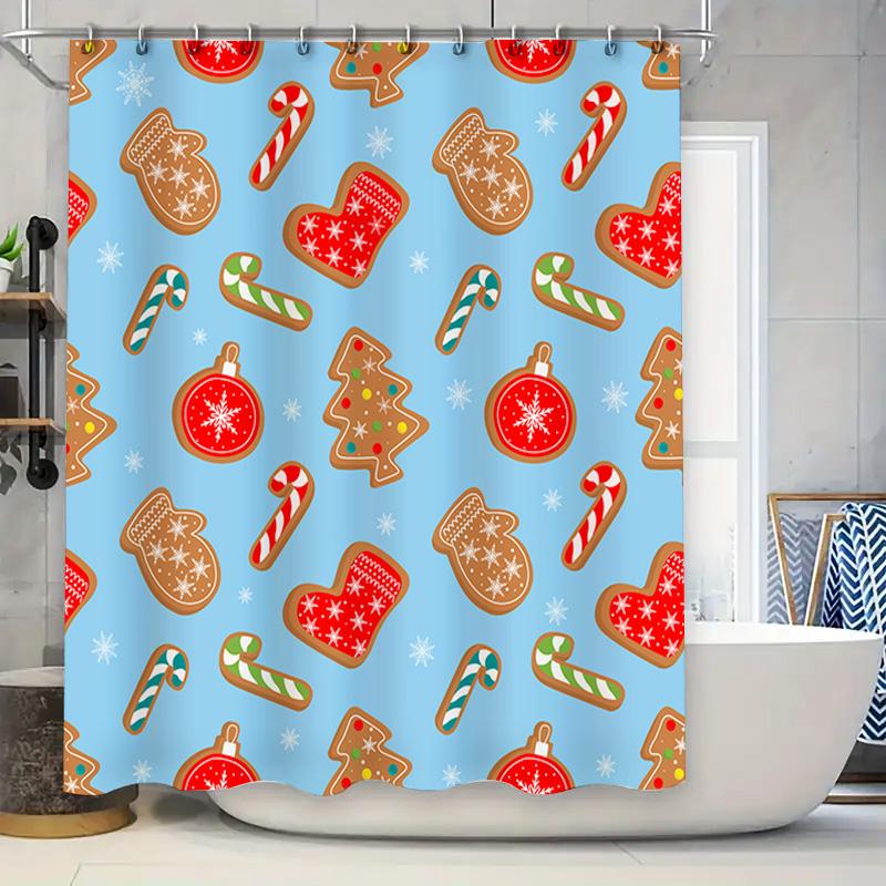 Christmas Shower Curtain Decorative Fabric Printing Waterproof Bathroom Shower Curtains with Gingerbread Man Cookie Candy Cane P