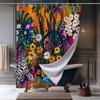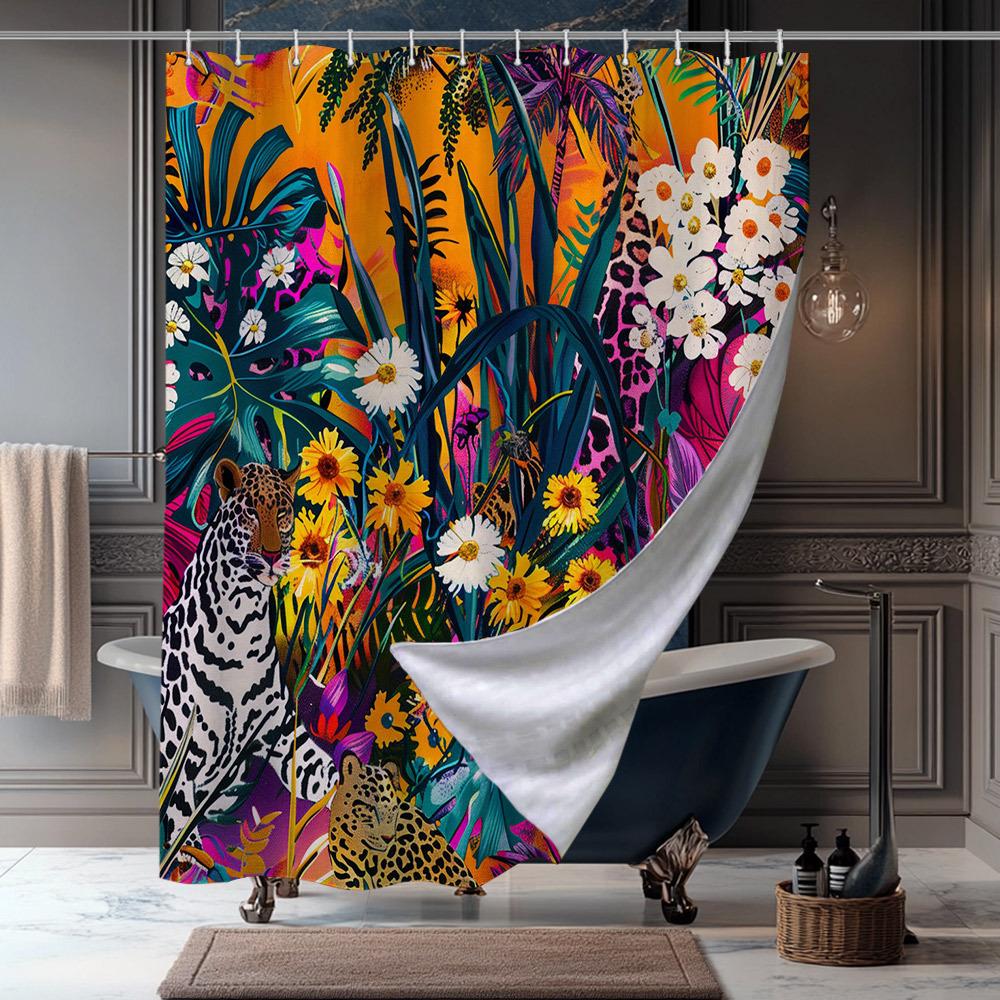 Jungle Leopard Shower Curtain - Black-Spotted Leopard, Tropical Plants, Gradient Orange Sky, 70.8x70.8, Fade-Resistant Polyester