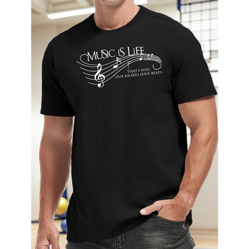 European Sizes Men'S Music Is Life Graphic Tee, Casual Crew Neck Polyester T-Shirt, Knit Fabric, Slight Stretch