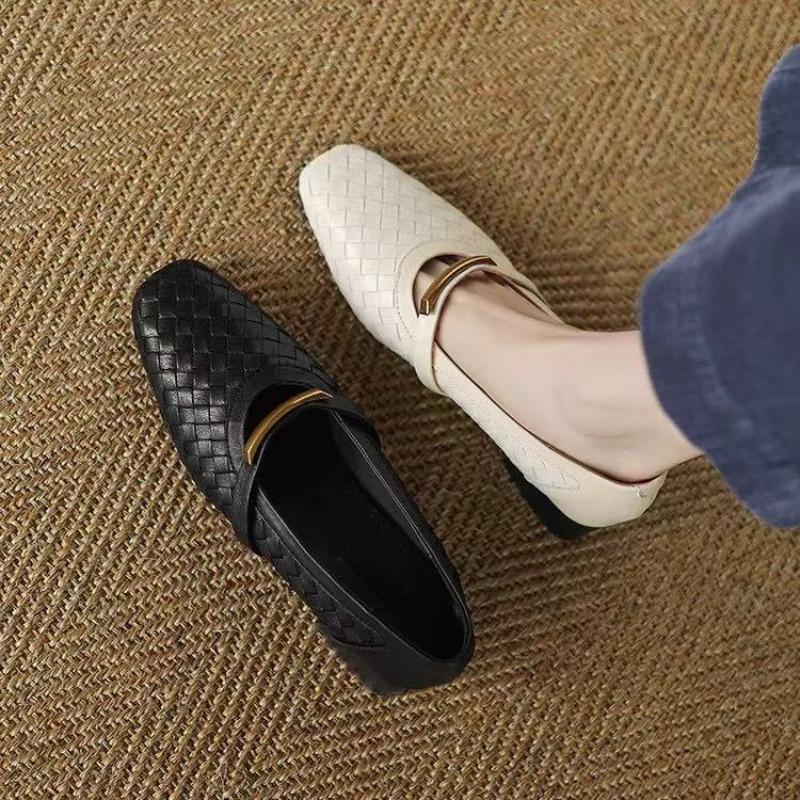 Women's Fashionable and High-quality Woven Leather Metal Decoration Square Comfortable Low Heel Versatile Single Shoes