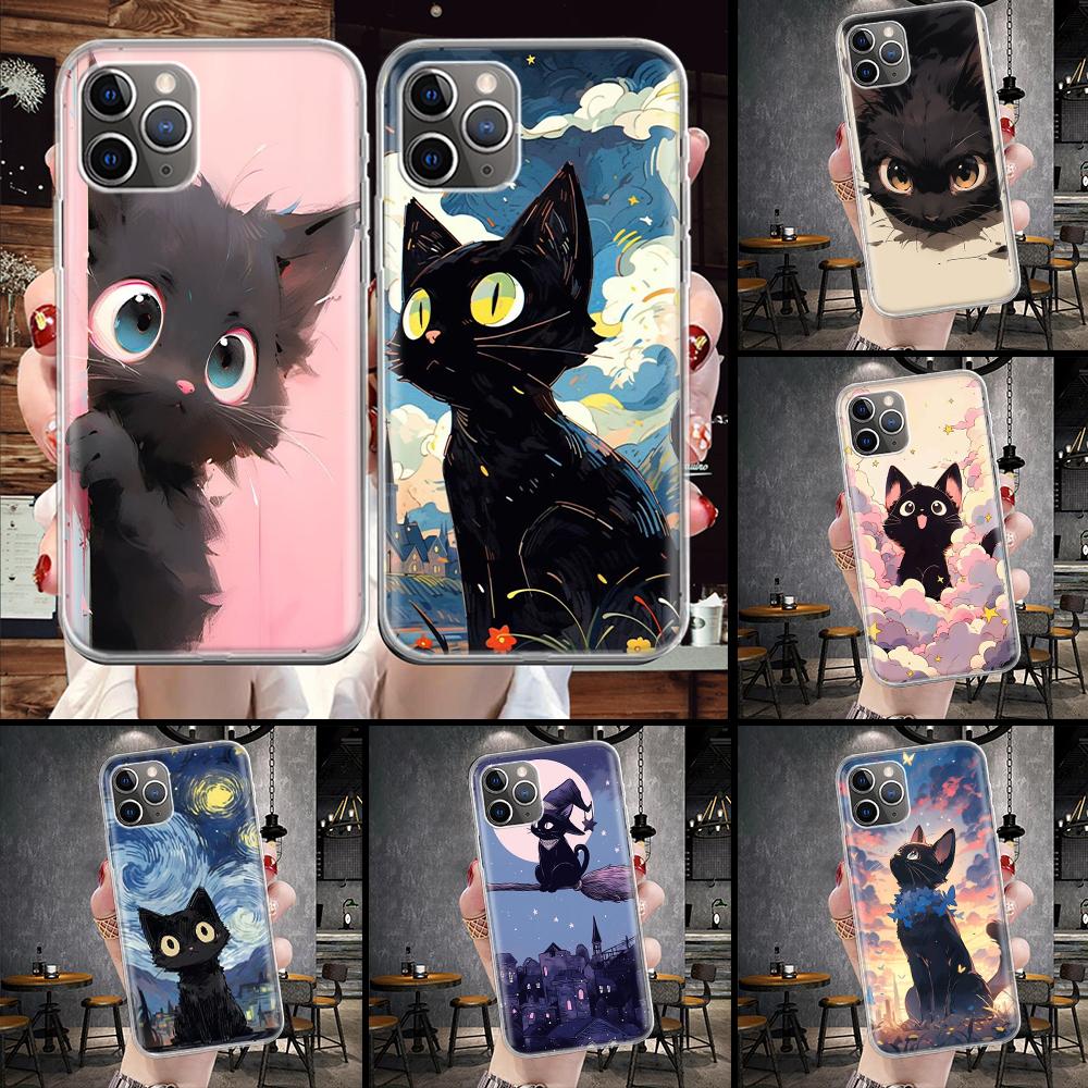 Anime Cute Black Cat Meow Soft Phone Case For IPhone 11 17 Air 16E 16 Pro Max 15 + 14 Plus 13 Mini 12 Apple 7 SE 8 Fundas Coque