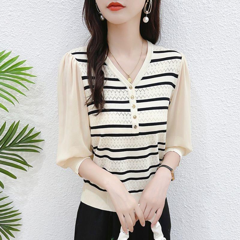 Summer Women V Neck Stripe Puff Sleeve Knit Chiffon Patchwork Top