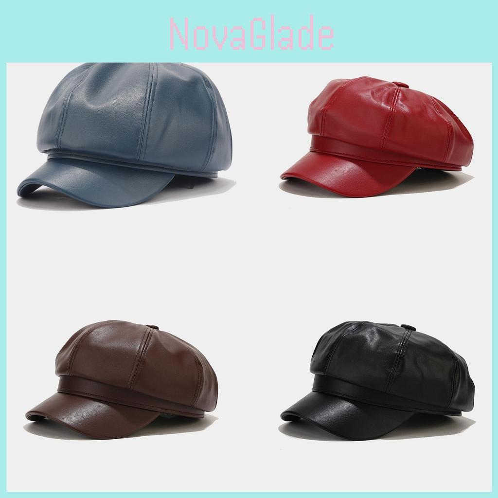 This womens eight-sided cap features a rounded crown and curved brim, crafted from durable PU leather. Measuring one size fits most, it offers sun protection and wind resistance, making it suitable for winter outings. Its stylish design complements casual, vintage, or Korean-inspired fashion. Wipe clean with a damp cloth to maintain its appearance.