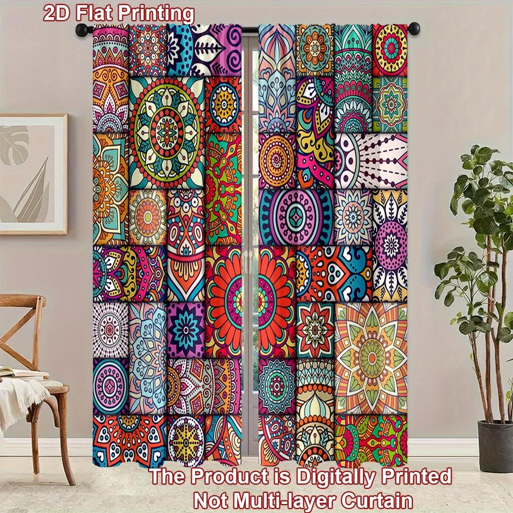 2PC Bohemian Mandala Patchwork Curtains - Vibrant Hippie Print Window Drapes for Living Room Bedroom Decor