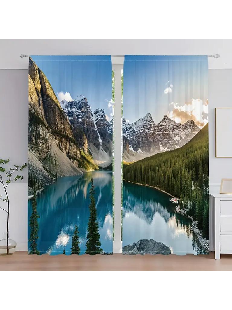 2pcs Breathtaking Mountain Lake Printed Curtains, Designed for Light Filtering, Quality Material, Ideal for Nature-Lover Home Wi