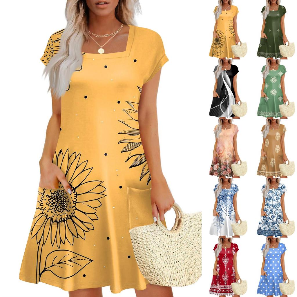 Summer Dresses For Women Loose Square Neck Cap Sleeve Casual Beach Vacation Tshirt Dress Sundresses With Pockets