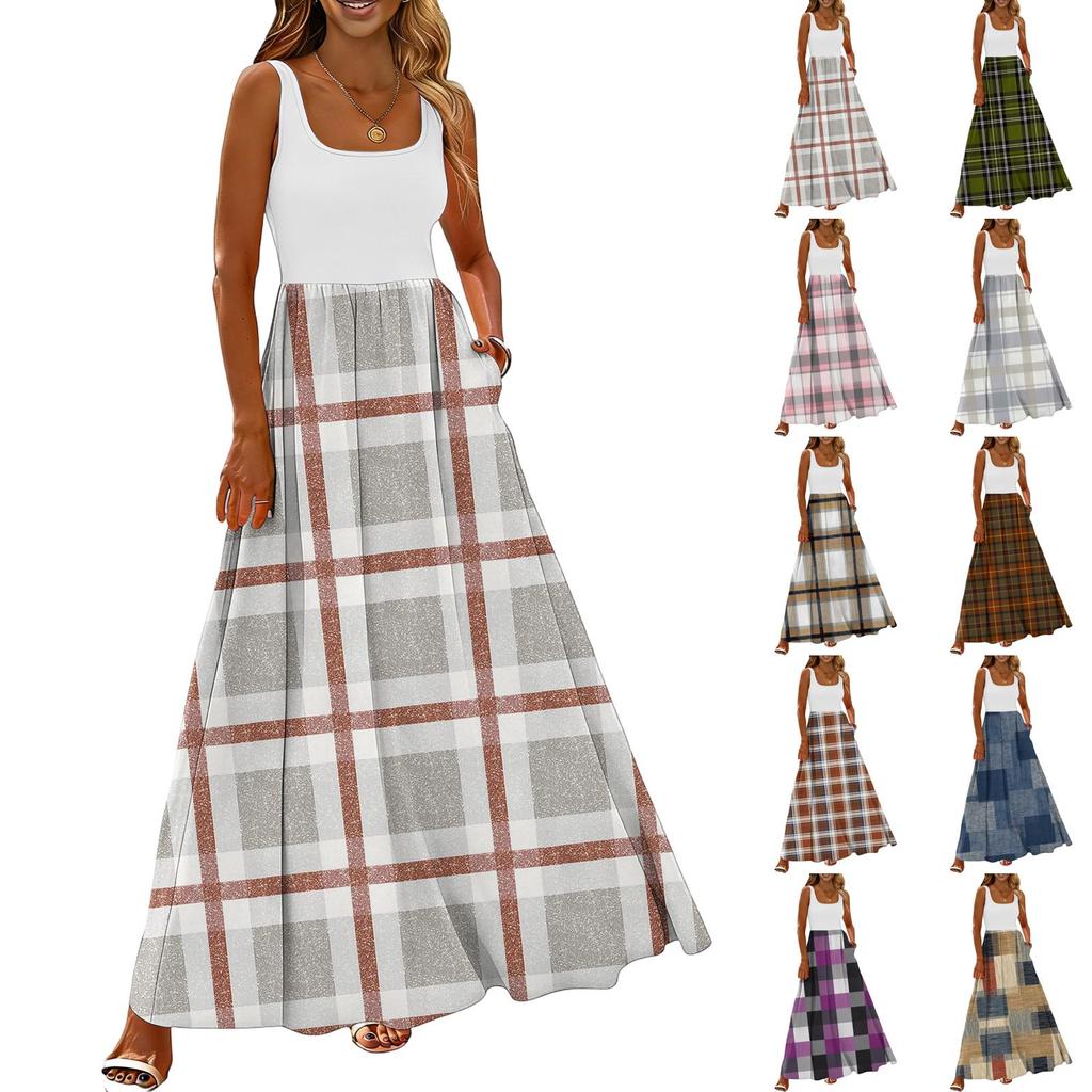 Ladies' plaid printed summer casual and fashionable sleeveless long dress