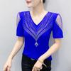 Summer V Neck Mesh Korean Fashion Patchwork Diamond Shirt Short Sleeve Women T Shirt