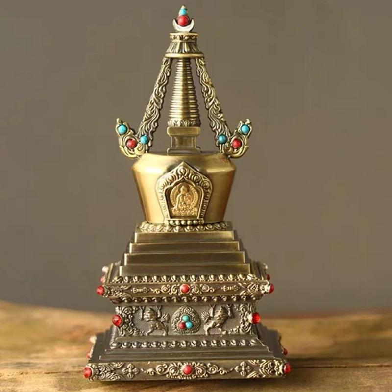 Bronze Tibetan Stupa Tantric Engraved Buddhist Statue Pearl Inlaid Gemstone Alloy Handicraft Altars Indoor Desktop Decorative