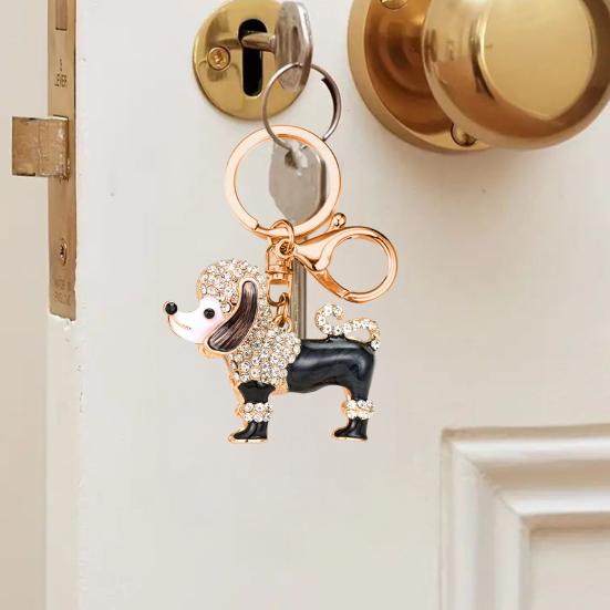 This exquisite poodle keychain features a durable alloy electroplating process, ensuring long-lasting color that resists fading. Adorned with sparkling rhinestones and vibrant enamel glaze available in pink, black, blue, beige, and more, it dazzles beautifully under light.