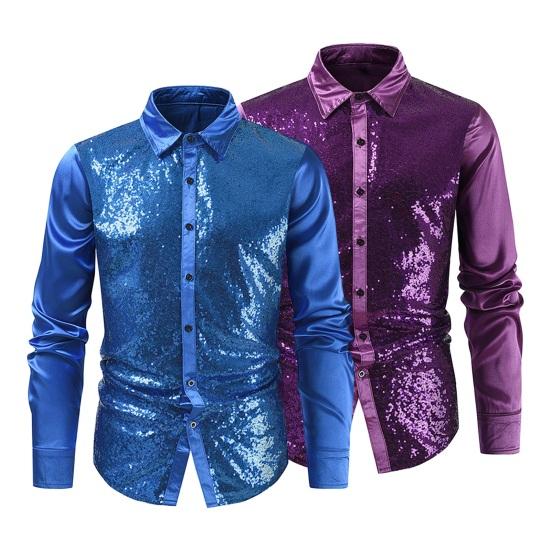 Men Performance Shirt Shiny Sequin Turn-down Collar Single-breasted Long Sleeves Buttons Satin Club Party Stage Show Shirt
