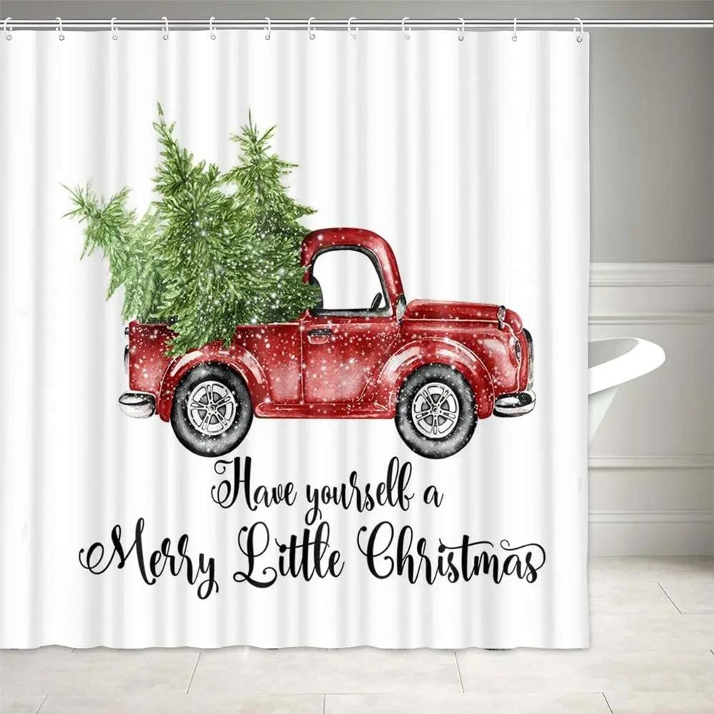 Christmas Truck Shower Curtain Vintage Xmas Car With Snowy Pine Fir Tree New Year Bathroom Accessories Holiday Bath Curtains Set