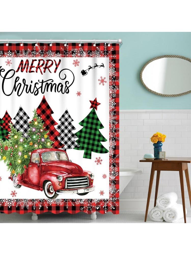Merry Christmas Truck Shower Curtain Buffalo Plaid Xmas Trees Home Bathroom Decorations Winter Snowflakes Farmhouse Bathtub