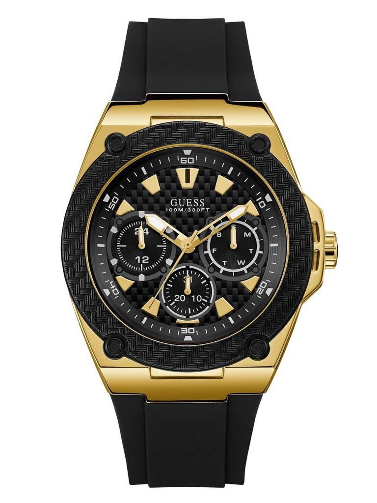 Comfortable black stain-resistant silicone strap with gold-tone buckle closure.
