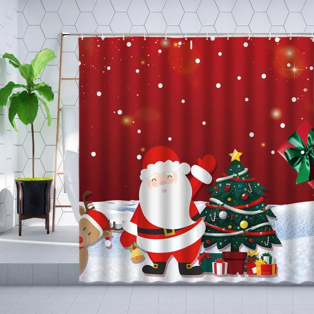 Merry Christmas Shower Curtain Santa Claus Elk Snow Scenery Tree Holiday Gift Red Decor Wall Cloth Bathroom Screen Curtains Sets