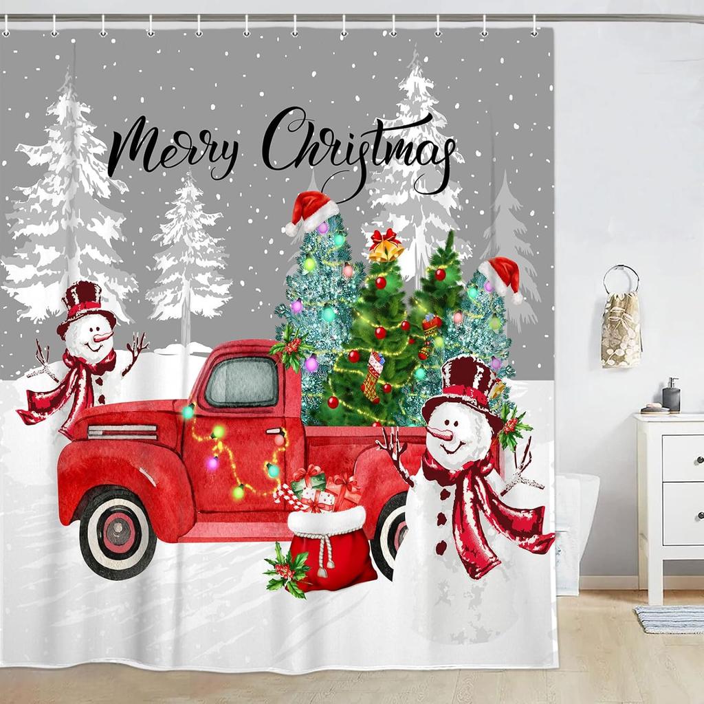 Christmas Winter Shower Curtain, Snowman with Red Truck Shower Curtain Set for New Year Bathroom Decor, Xmas Ball Tree Festival