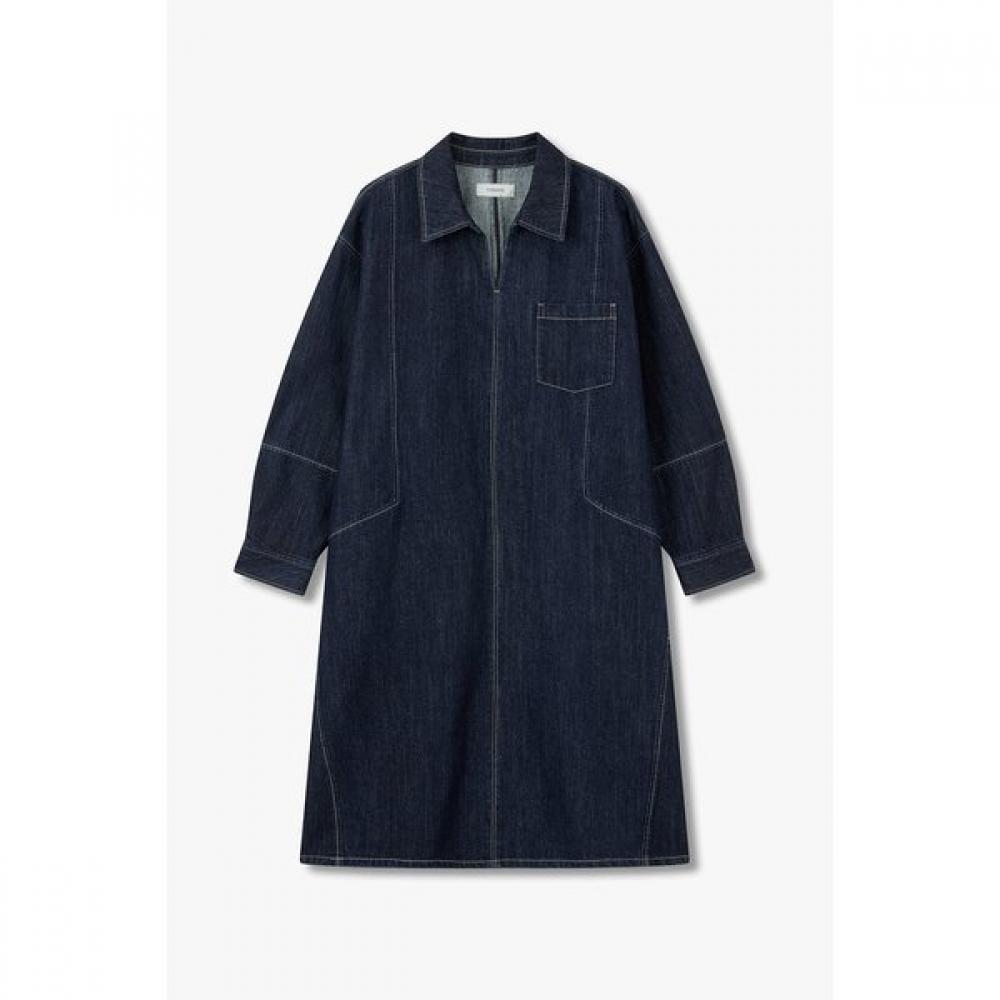 The collar neck tunic denim dress features a clean straight fit silhouette. The center front incision and vertical incision on both sides accentuate a slim look while providing a comfortable fit with its moderate thickness. It creates a natural silhouette that suits your body type, available in a single color of indigo.