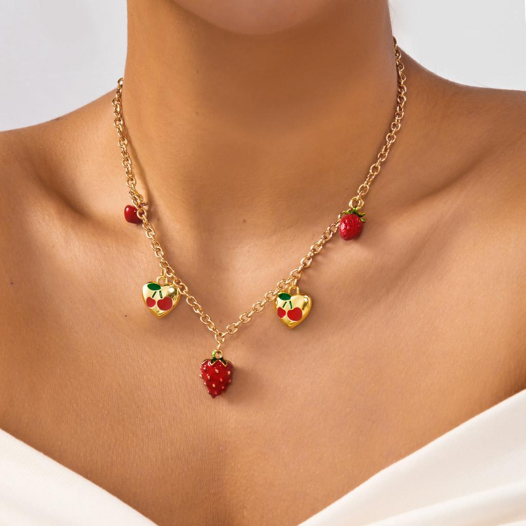 Summer Fashion Heart Cherry Fruit Pendant Necklace With Adjustable Chain For Women