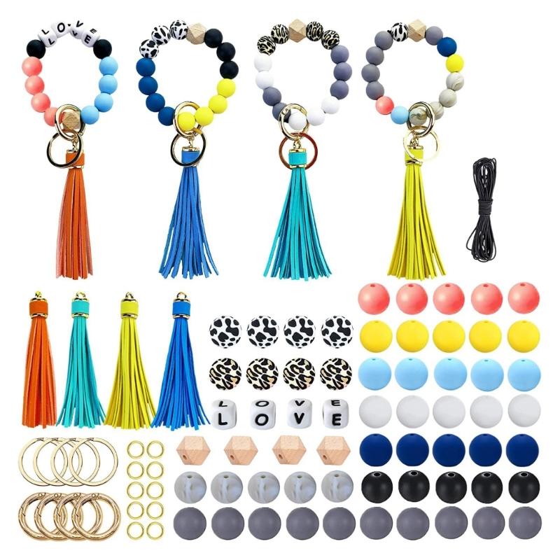 Package Include: 52 pcs silicone beaded, 4 pcs love heart beaded, 4 pcs natural hexagon wooden beads, 4 pcs different color faux leather tassel, black elastic rubber bands, jump rings, for key rings and spring O rings. Enough for you to make 4 pcs beaded keychains.