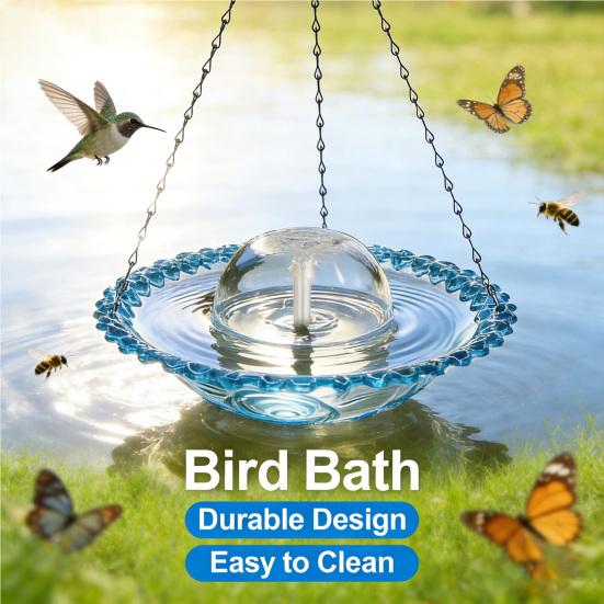 Equipped with a USB powered built-in water pump, this bird bath offers energy-efficient automatic water circulation. With its elegant bright blue bowl and sturdy hanging chains, it serves as both a functional bird feeder and a stylish garden decoration. Easy to install and maintain, simply hang it in a suitable spot, add water, and power on to enjoy vibrant outdoor wildlife effortlessly.