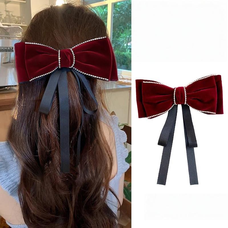 Fashion Retro Rhinestone Velvet Bow Ribbon Hairpin For Woman Temperament Back Of The Head Hair Clips New Year Hair Accessories