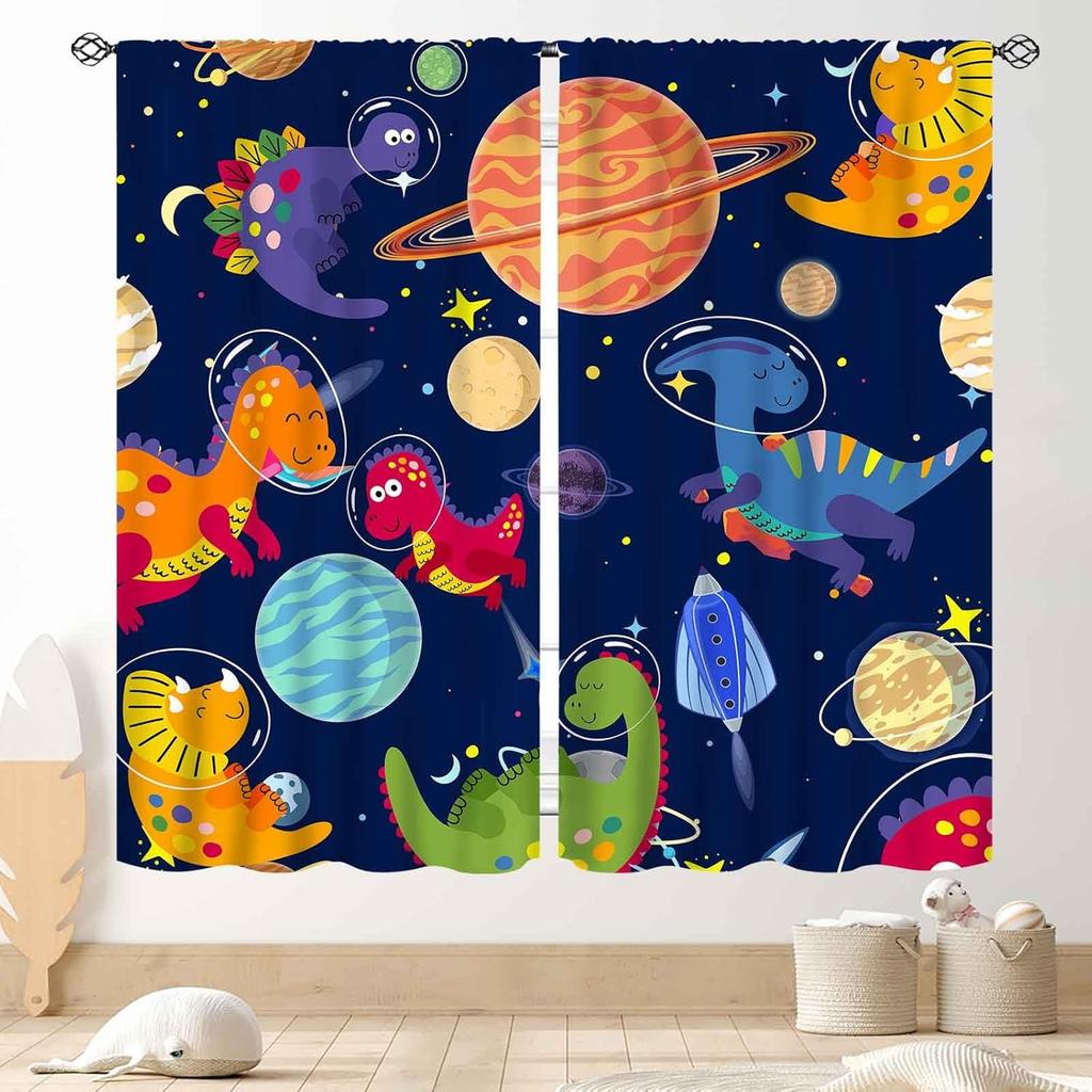 Dinosaur Curtains Boys Room Cartoon Dino Navy Blue Safari Animal Outer Space Planet Astronaut Theme Baby Window Curtain Blackout Polyester