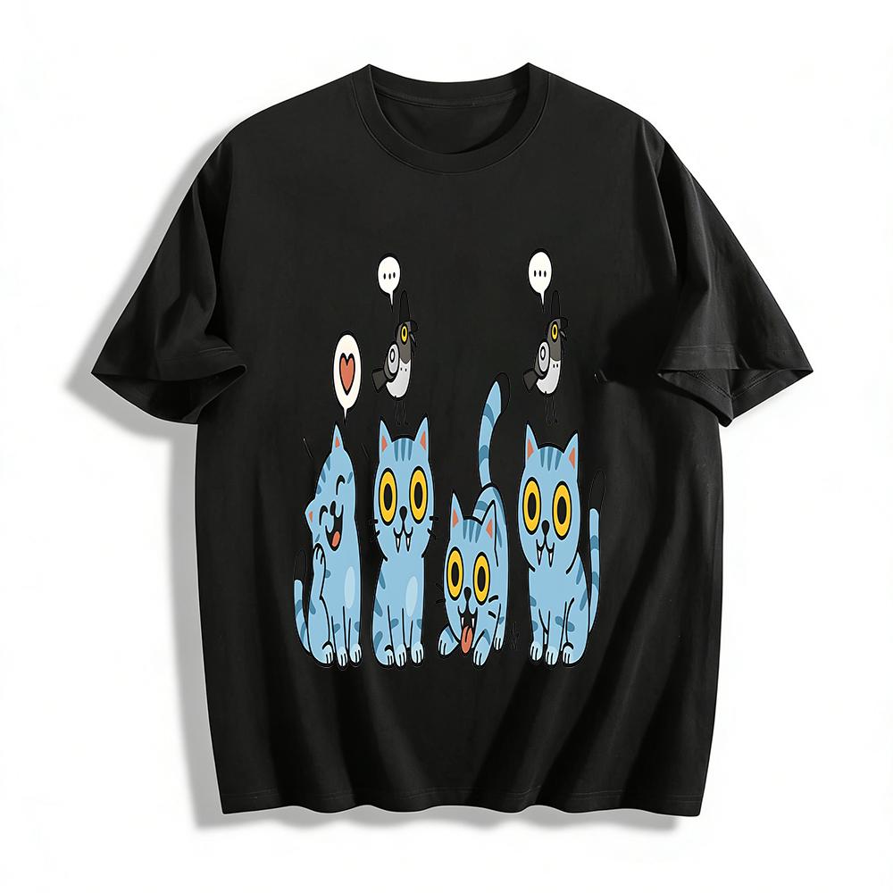 Cute Blue Cat And Bird Print T-Shirt Unisex Casual Loose Animal Pattern Top For Daily Wear Pure Cotton T-shirt