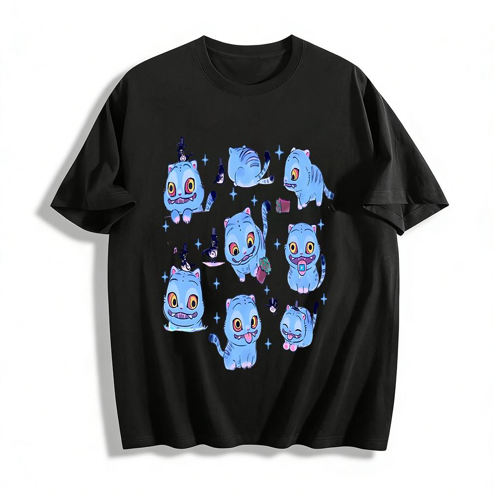 Cute Funny Blue Cat Print T-shirt, Unisex Casual Tee With Creative Cat And Bird Pattern Pure Cotton T-shirt