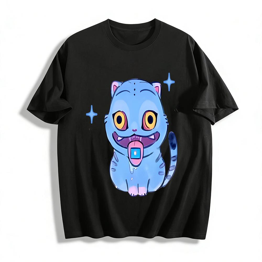 Funny Tongue-Out Blue Cat Print Casual Top Unisex Fun Cartoon Pattern Loose Breathable Daily T-Shirt Pure Cotton T-shirt