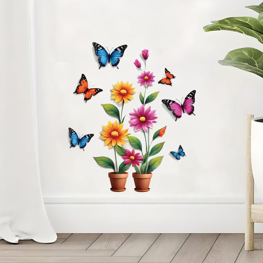 Self-adhesive Creative Colorful Butterflies Flowers Potted Plant Wall Stickers for Living Room TV Bedroom Headboard Home Decor
