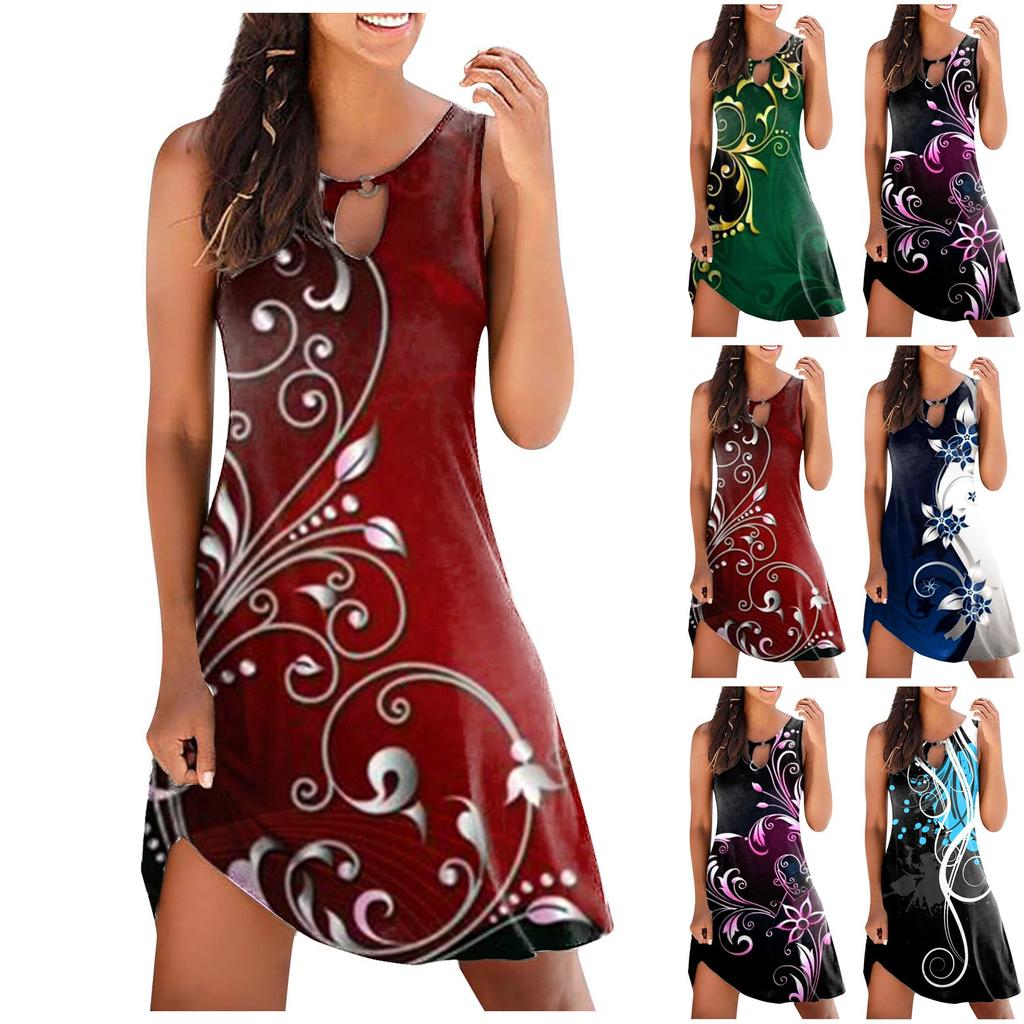 Women Casual Summer Printed Tank Sleeveless Dress Hollow Out Loose Beach Dress