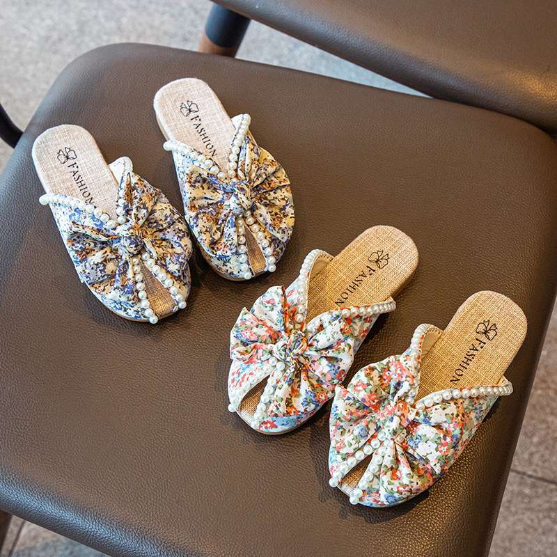 Girls Pearl Bow Fish Mouth Slippers New Summer Soft-soled Girls Princess Shoes Student Korean Version Flat Slippers