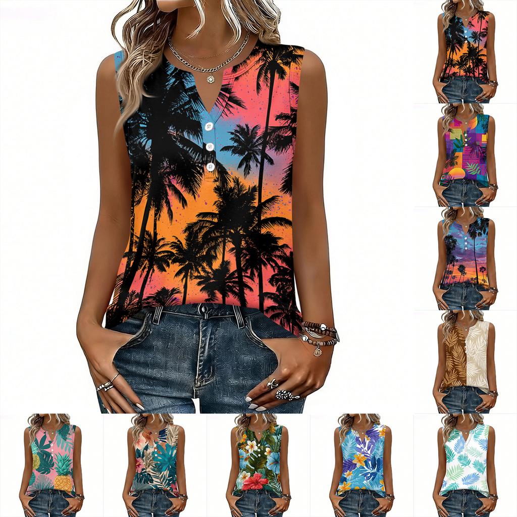 Women's Fashionable Casual Hawaiian Print Sleeveless Button Vest Top