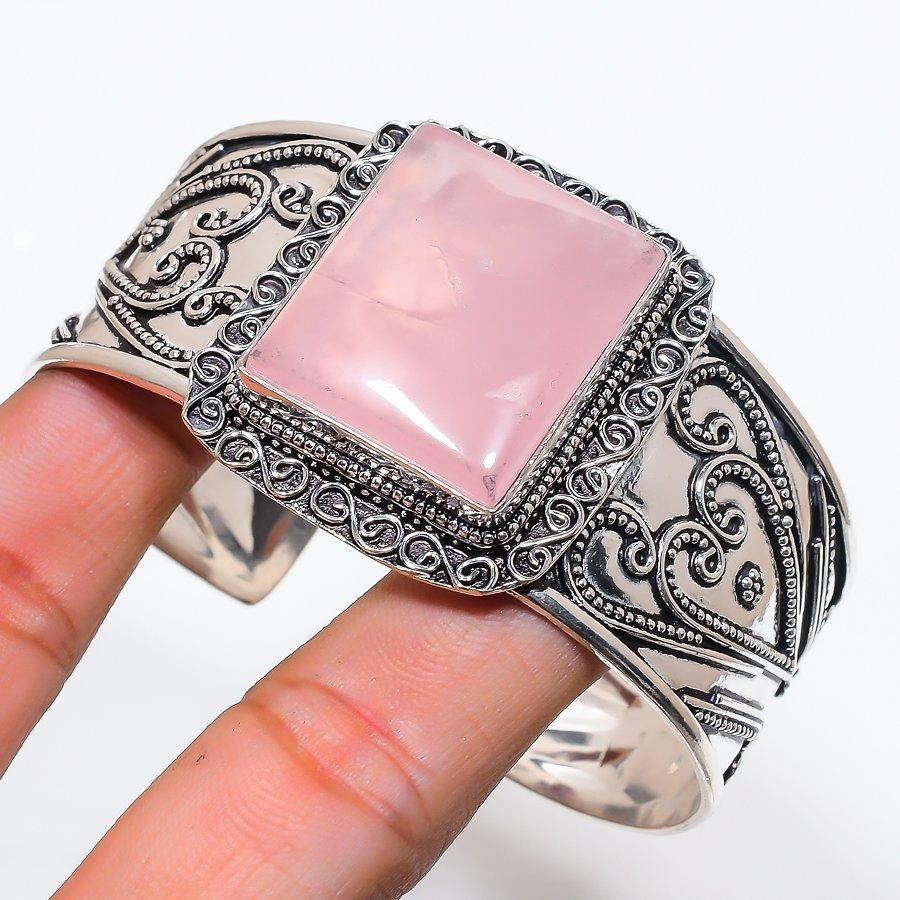 Natural Rose Quartz Gemstone 925 Sterling Silver Cuff Bangle Adjustable AC-1406