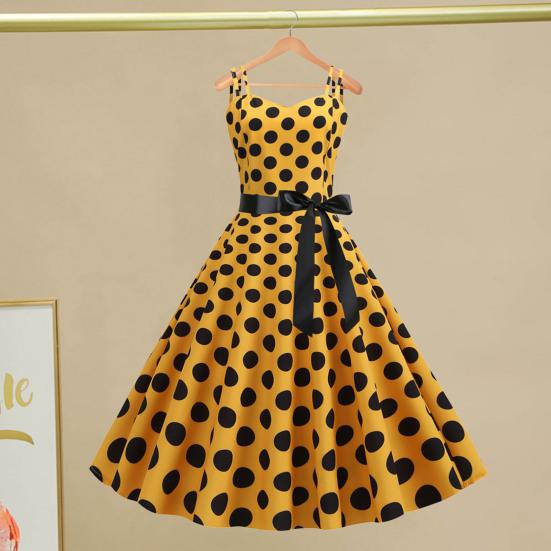 Elevate your style with this versatile Women's A-line Dress. The sleeveless halter design is perfect for summer and spring, while the retro dot pattern adds a touch of charm. Featuring suspenders, dropped shoulders, waist tie straps, and a flowing umbrella hem, this dress exudes elegance.