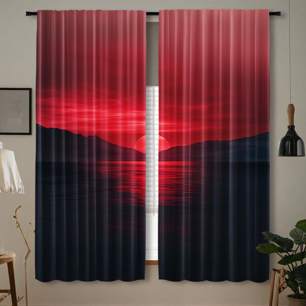 Modern Art Inspired Ribbed Pocket Curtains Tricot Polyester Plain Ombre Sunset Seascape Print Semi Sheer Room Darkening Set Of 2 Made