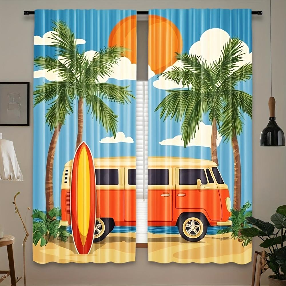 Set Of 2 Retro Beach Bus Print Polyester Curtains Vibrant Sunset Palm Tree Design Style Living Curtain Sheer Made With Rod Pocket