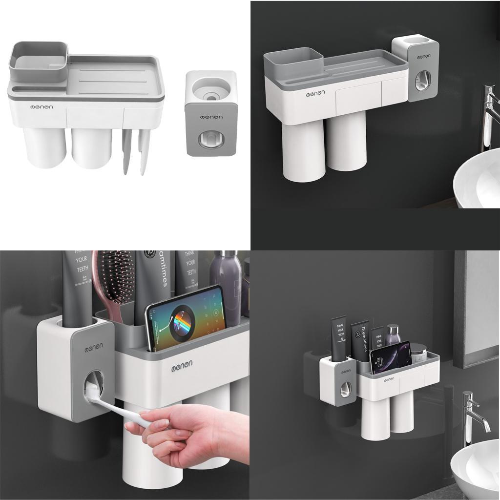 Toothbrush Holder Toothpaste Stand Bathroom Storage Organizer Self Wall Mounted Without Drilling Toothpaste Squeezer Dispenser