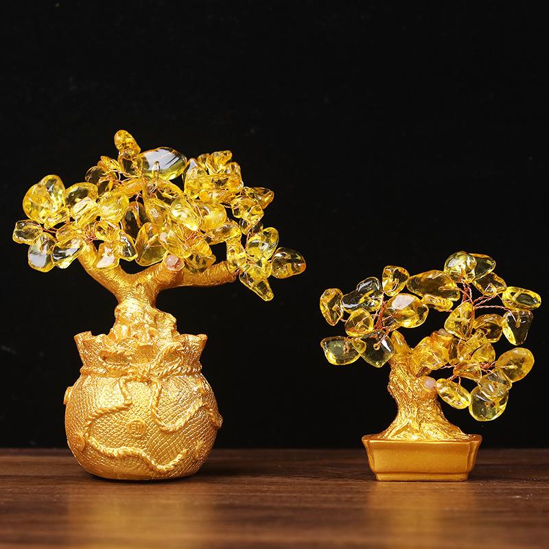Feng Shui Art Decoration Tabletop Lucky Wealth Tree 19cm 14cm Delicate Yellow Crystal Money Tree Ornament Home Office Shop