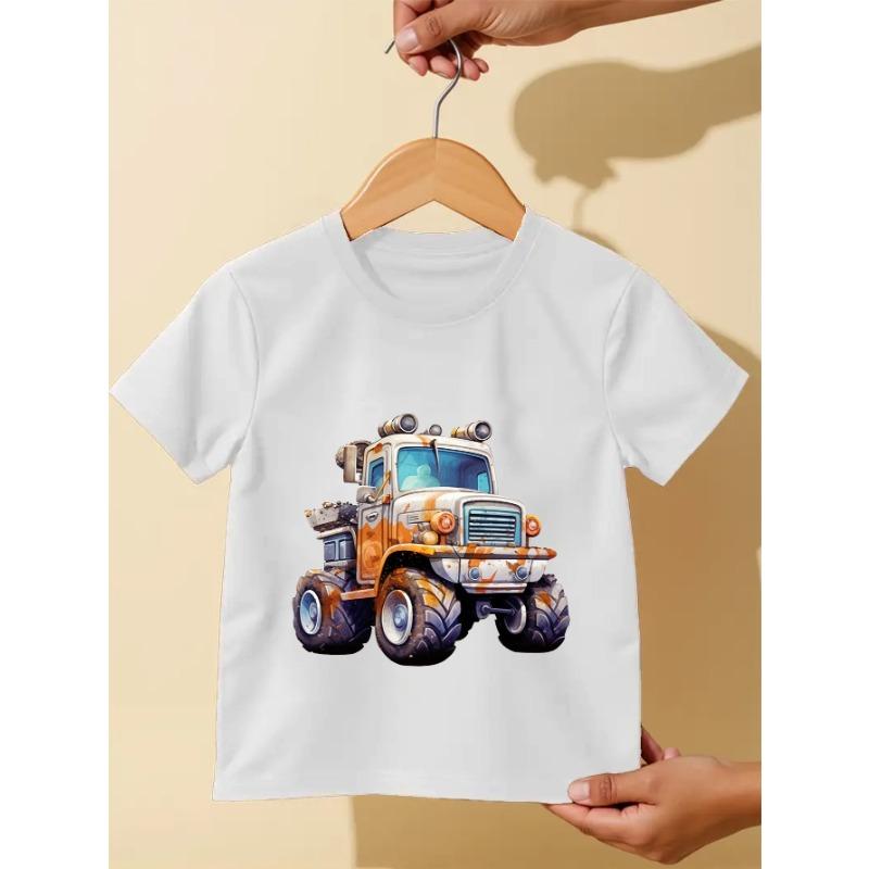 European Size Childrens Round-neck Short-sleeved T-shirt with Colorful Truck Pattern Print