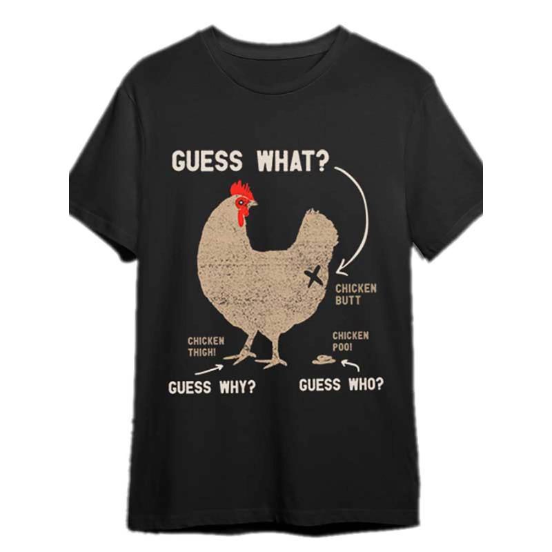 European Sizes Fun "Guess Chicken Butt" Men's Printed T-shirt- Black Short Sleeved Casual Shirt with Humorous Chicken Pattern Design