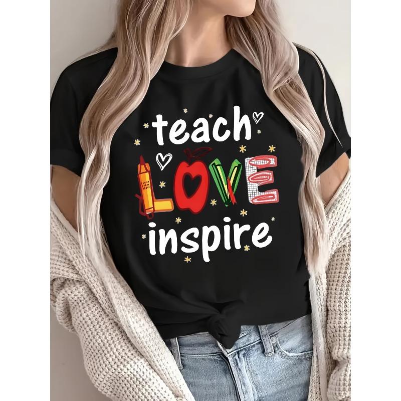 Letter Print T-shirt, Short Sleeve Crew Neck Casual Top for Summer & Spring, Women's Clothing