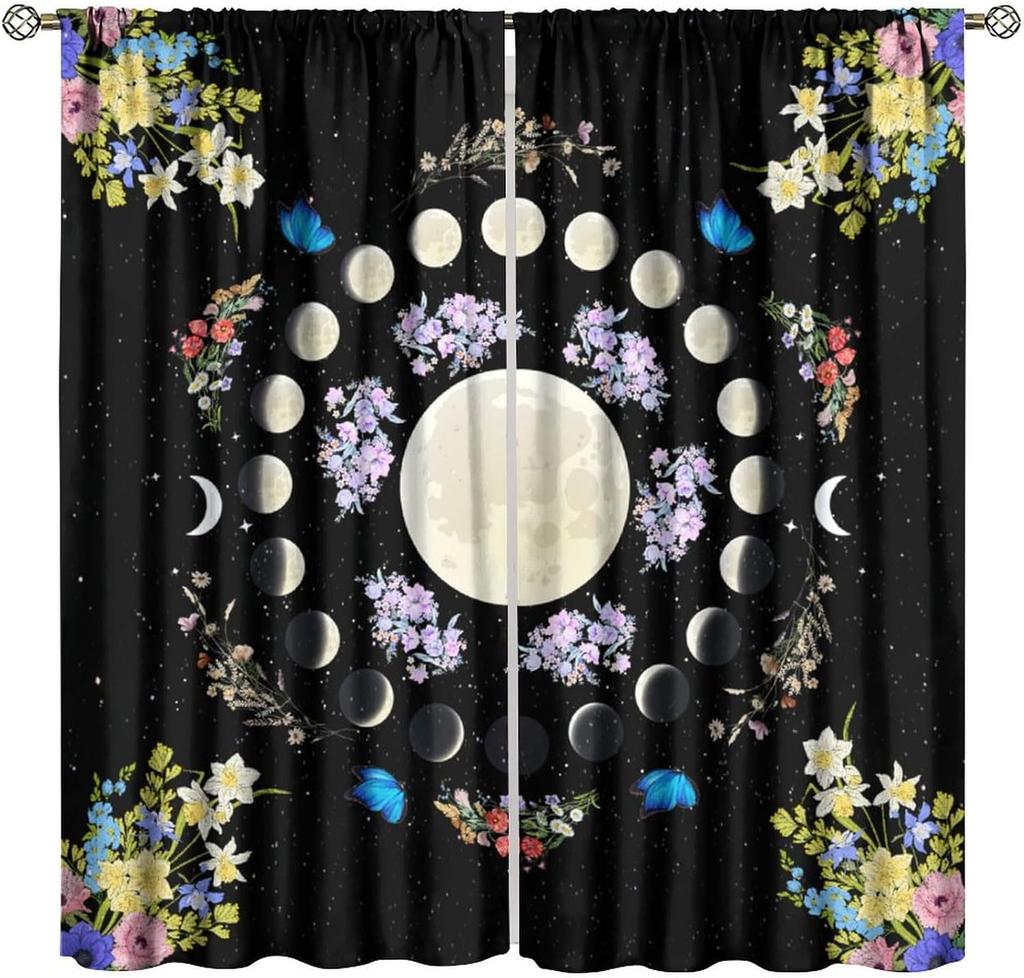 Bohemian Butterfly Moon Floral Curtains Vintage Mandala Flower Leaves Plants Gothic Window Drapes Living Room Bed Darkening Polyester Great Decor