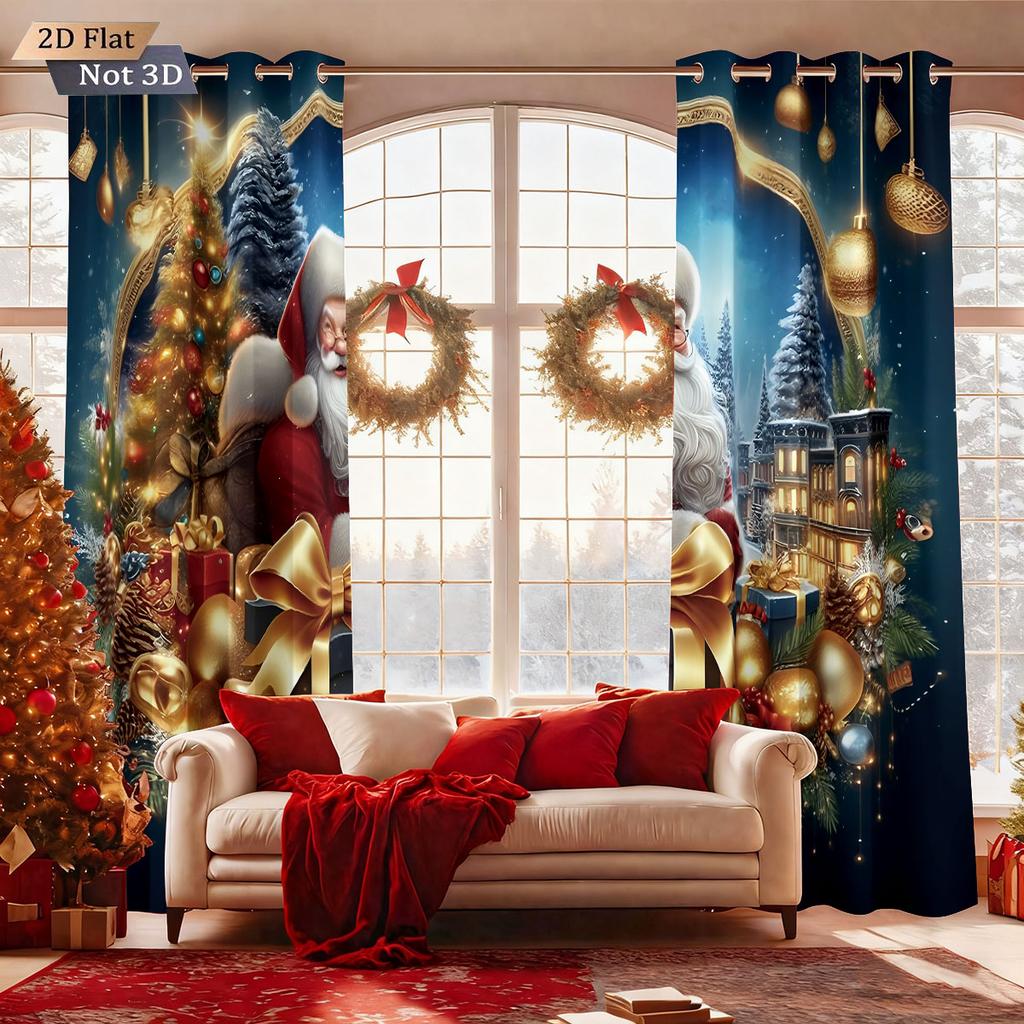 Set Of 2 Merry Christmas Santa Claus Gift Print Curtain Multiple Size Living Room Insulation Decoration Curtains Light Blocking Made Polyester Machine