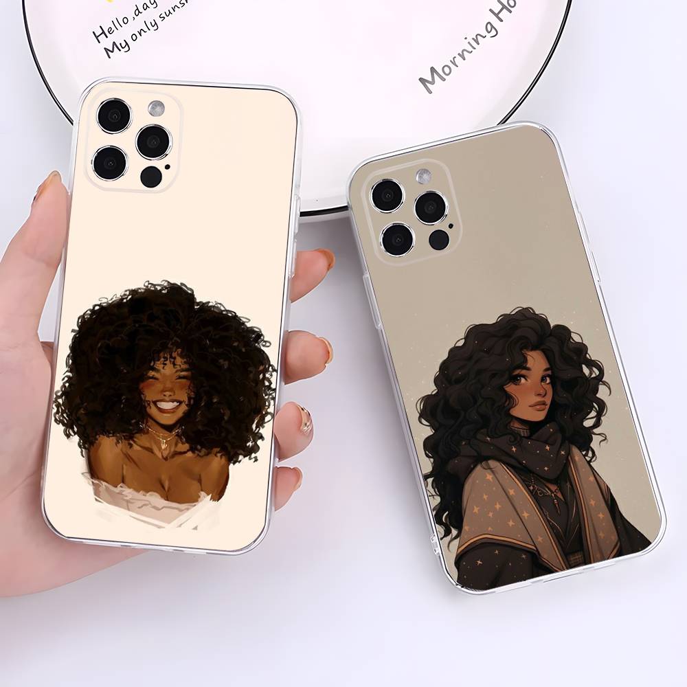 Afro Black Girl Cute Cartoon Phone Case For iPhone 17,16,15,14,13,12,11 Pro,Max,Plus,X,XS,XR,SE4,E Mini Transparent Soft Cover