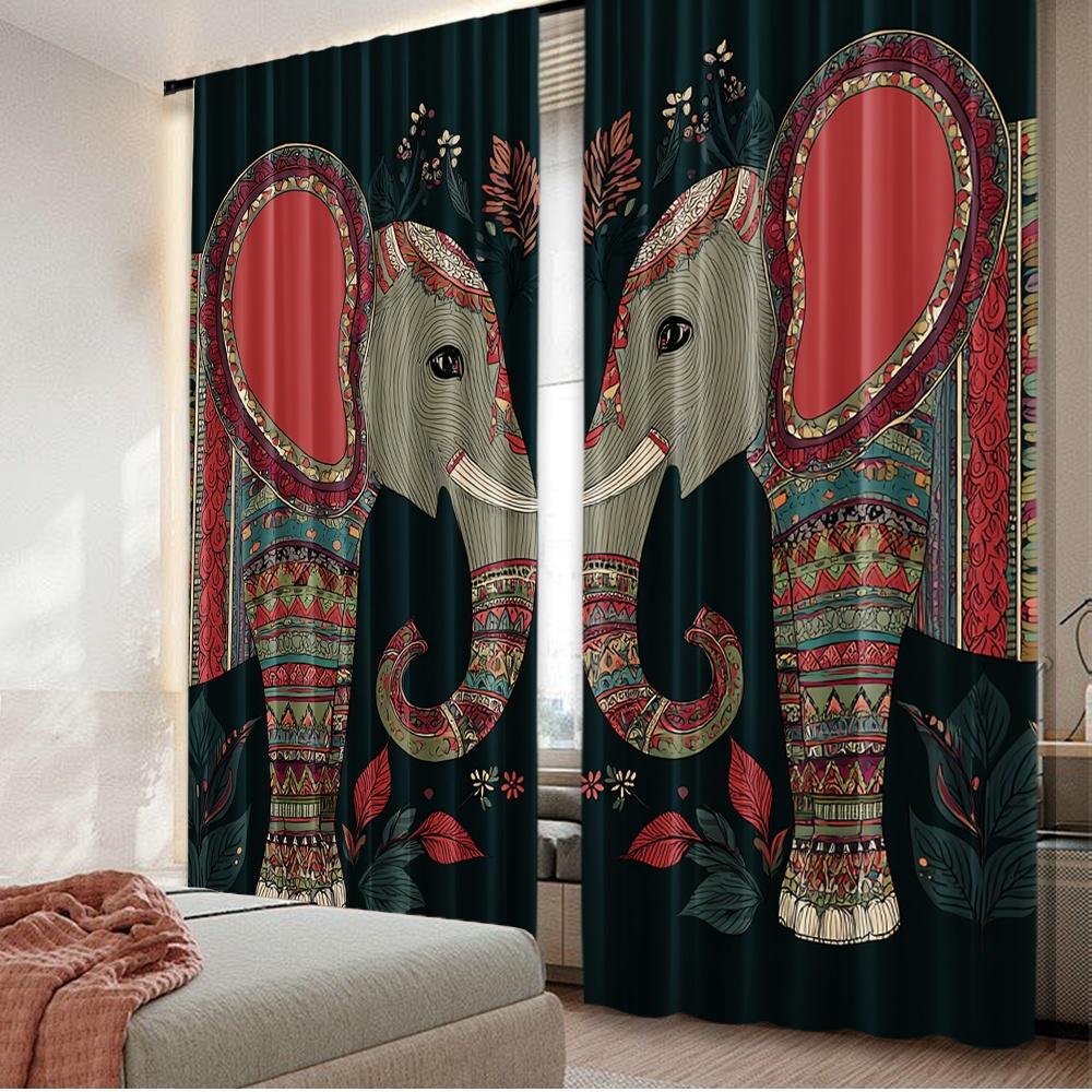 Set Of 2 Flat Printing Window Curtains Ative Twin Elephants Digital Printed Polyester Drapes Festive Wall Decor New Year Curtain Made
