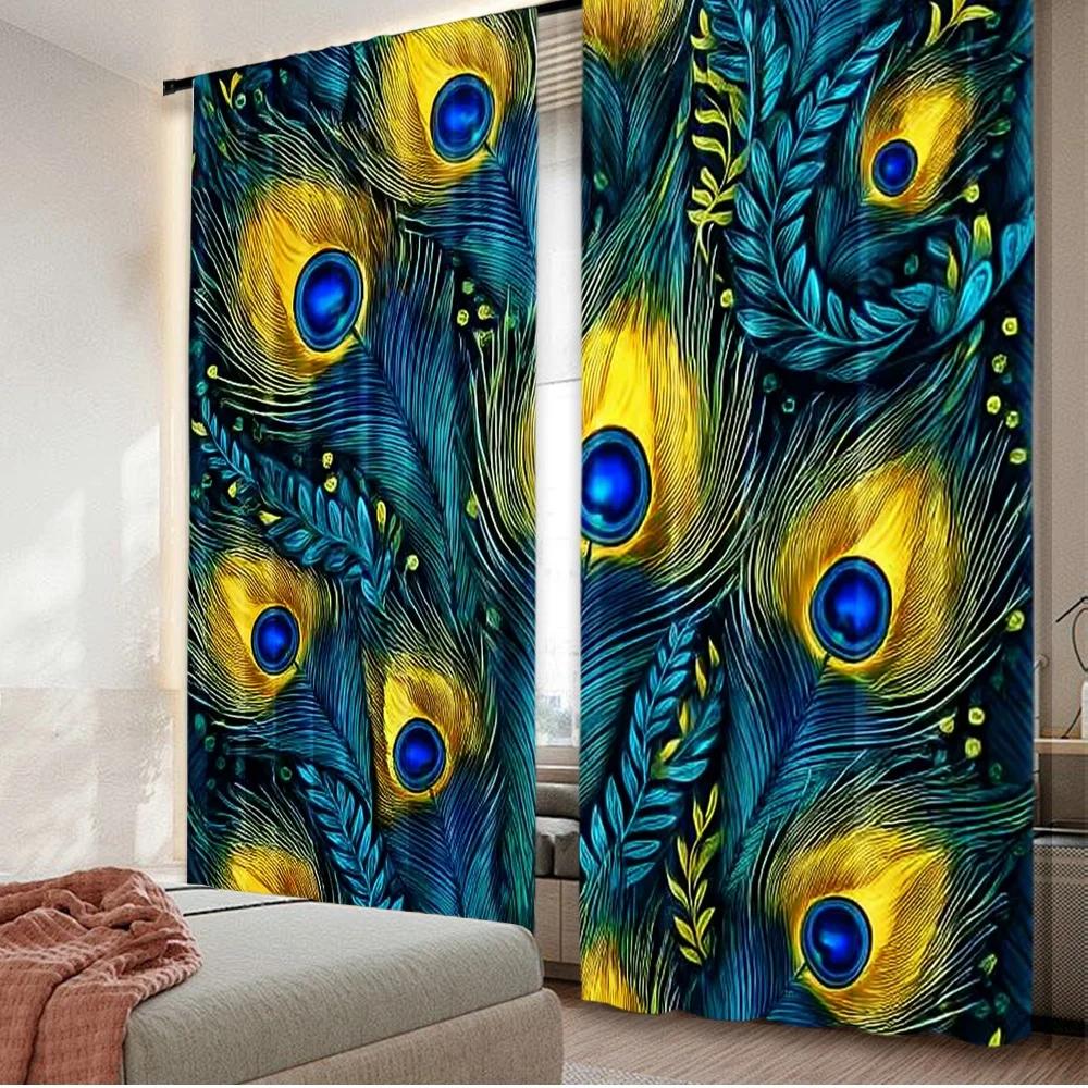 Flat Printing Curtain Peacock Feather Elegance Digital Printed Polyester Drapes All Season Party Holiday Decor Set Of 2 Made Washable