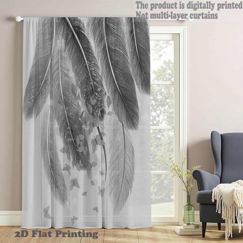 Black White Feather Pattern Curtains Minimalist Window Drapes Living Room Bedroom Home Decor Modern Light Filtering Polyester Sitting Treatment