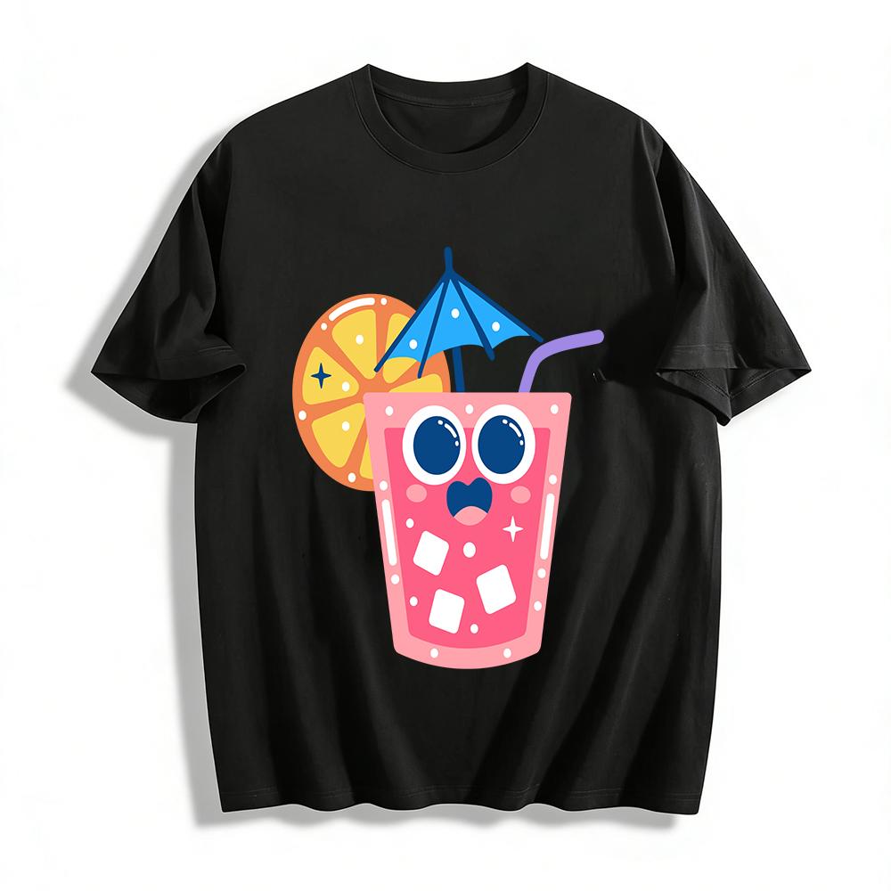 Cartoon Juice Cup Print T-Shirt Summer Fresh Funny Style Casual Breathable Cotton Top For Adults Kids Pure Cotton T-shirt