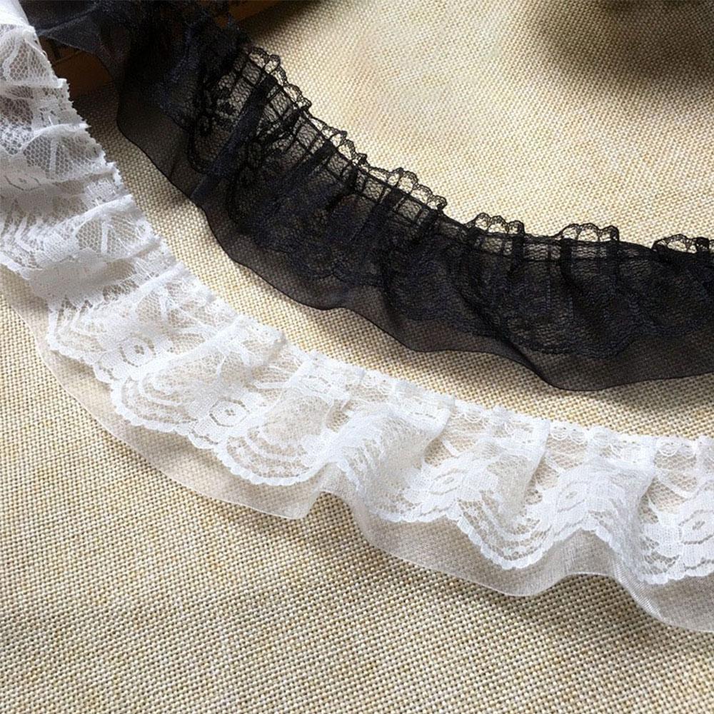 Eco-Friendly 5cm Chiffon Lace Ruffle Trim Double Layer Wrinkle Applique Ribbon for Garment 100cm Length BK WH 3D Pleated Fabric